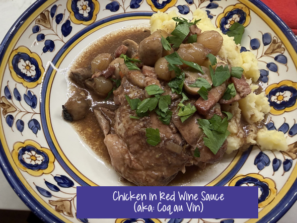 Ideally this recipe calls for marinating the chicken in the red wine (a whole bottle), onion, carrot, ground cloves, bay leaves and thyme, for 2 days. TWO DAYS! I didn’t read the recipe in time – so mine marinated a total of 2 hours. There is a lot of bacon in this, which gives the dish lots of flavor. The thighs (skin on, bone in) were browned on both sides in olive oil and butter, removed, then the bacon was added along with mushrooms, then everything else goes in, chicken on top, then the marinade (wine) is poured in. It’s brought to a simmer and gently cooked for about an hour. Then I added in frozen (but defrosted) pearl onions. And simmered for another 20-30 minutes.